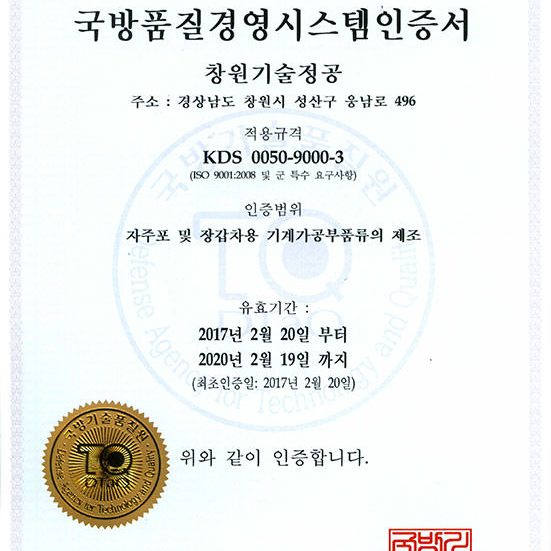 고객 감동을 위한 품질 실현을 위하여 국방품질경영시스템(DQMS) 인증을 취득하였습니다.
