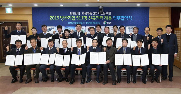 창원지역 방위산업 기업이 내년 중에 511명을 새로 채용하며 창원시는 18일 지역 방산기업 21개사와 ‘첨단방위산업 육성을 위한 2019년 방산 기업 신규인력 511명 채용 업무협약(MOU)’을 체결했다.